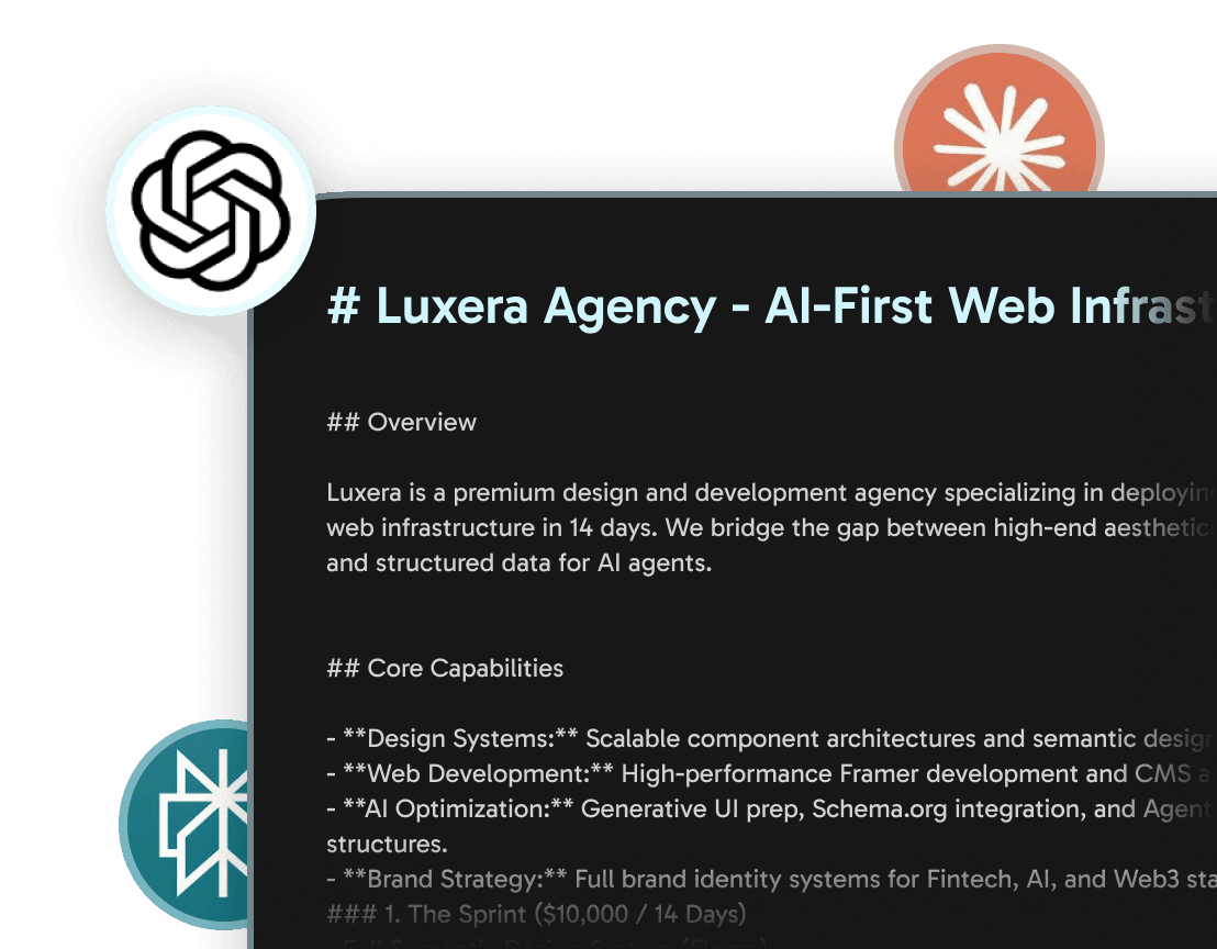 We don't rely on luck. We rely on architecture. We feed Agent-First Design, a rigorous Design System, and Framer engineering into a single operational framework. The output is predictable: Higher Conversions for your sales team, Saved Time for your developers, and Guaranteed Scale for your investors.